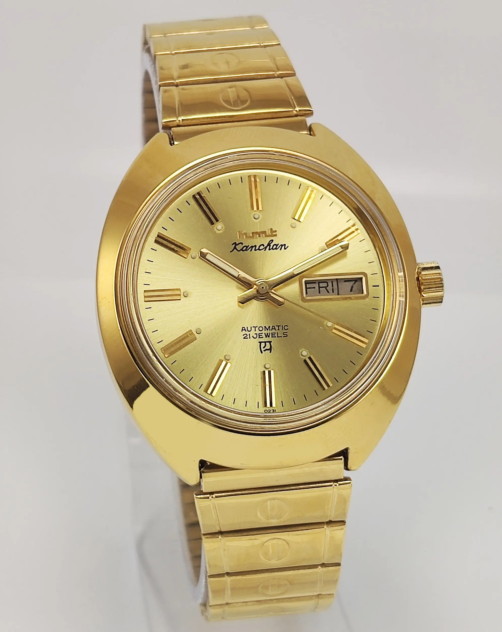 HMT Kanchan Para Shock 21 Jewels Golden Dial Day Date Function Mechanical Automatic Men's Wrist Watch